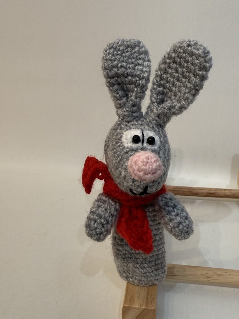 LIENEさんの編みぐるみ【赤いマフラーを巻いたウサギのパペット】