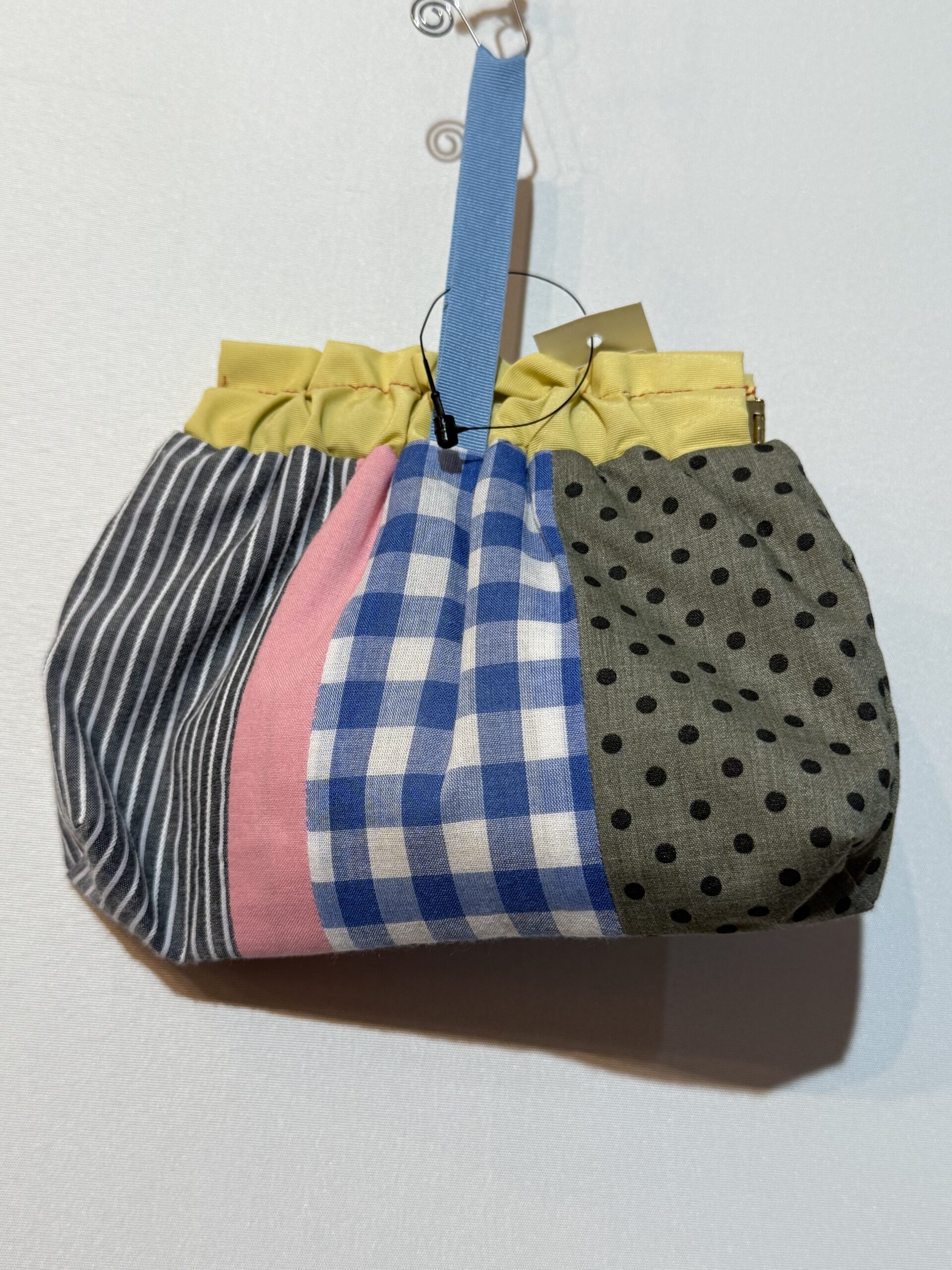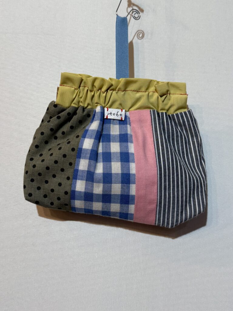 素材も色もさまざまな布を縦にパッチワークし、リボンの色もアクセントの楽しいポーチ。