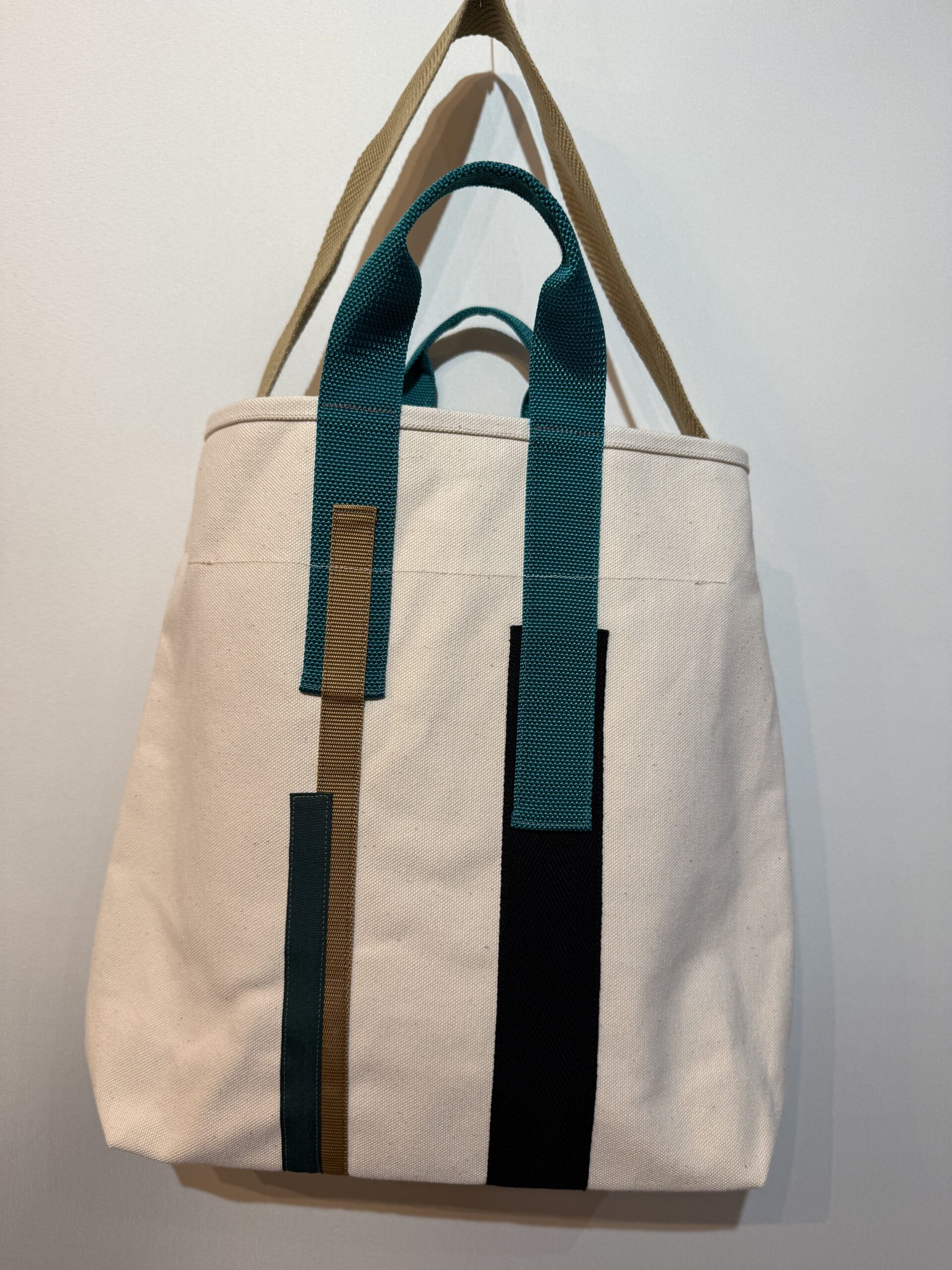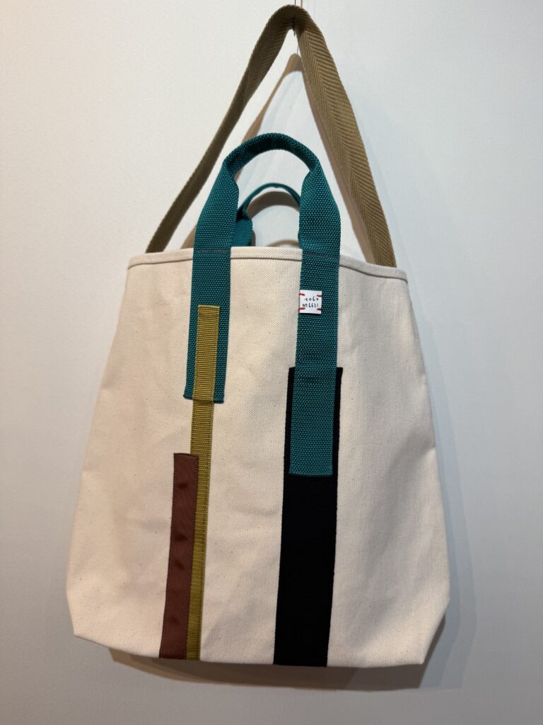 持ち手や持ち手につながるボディに色布をコラージュしたグラフィカルなデザインのトートです。